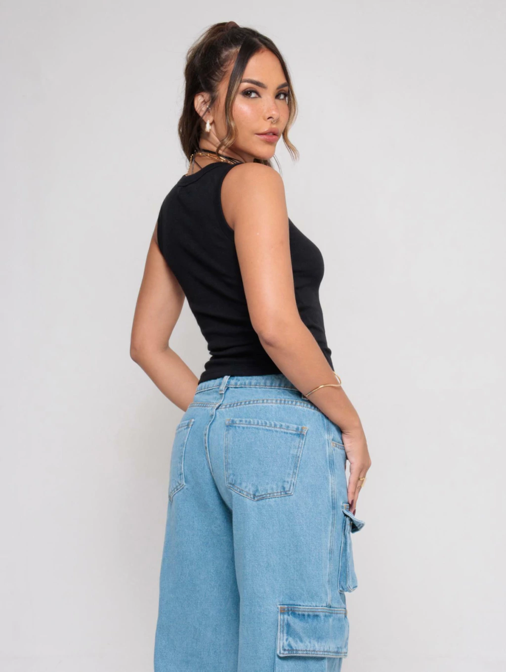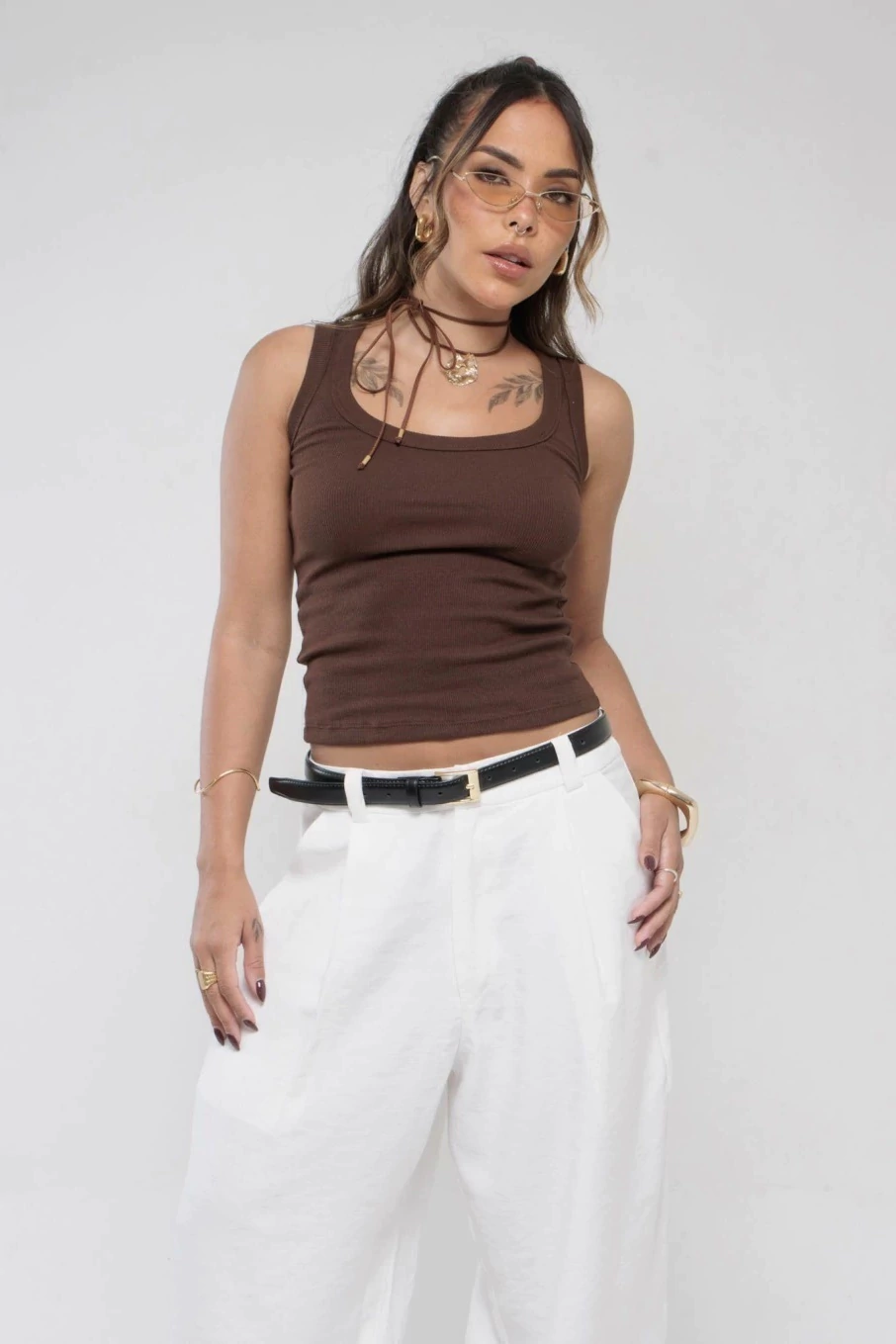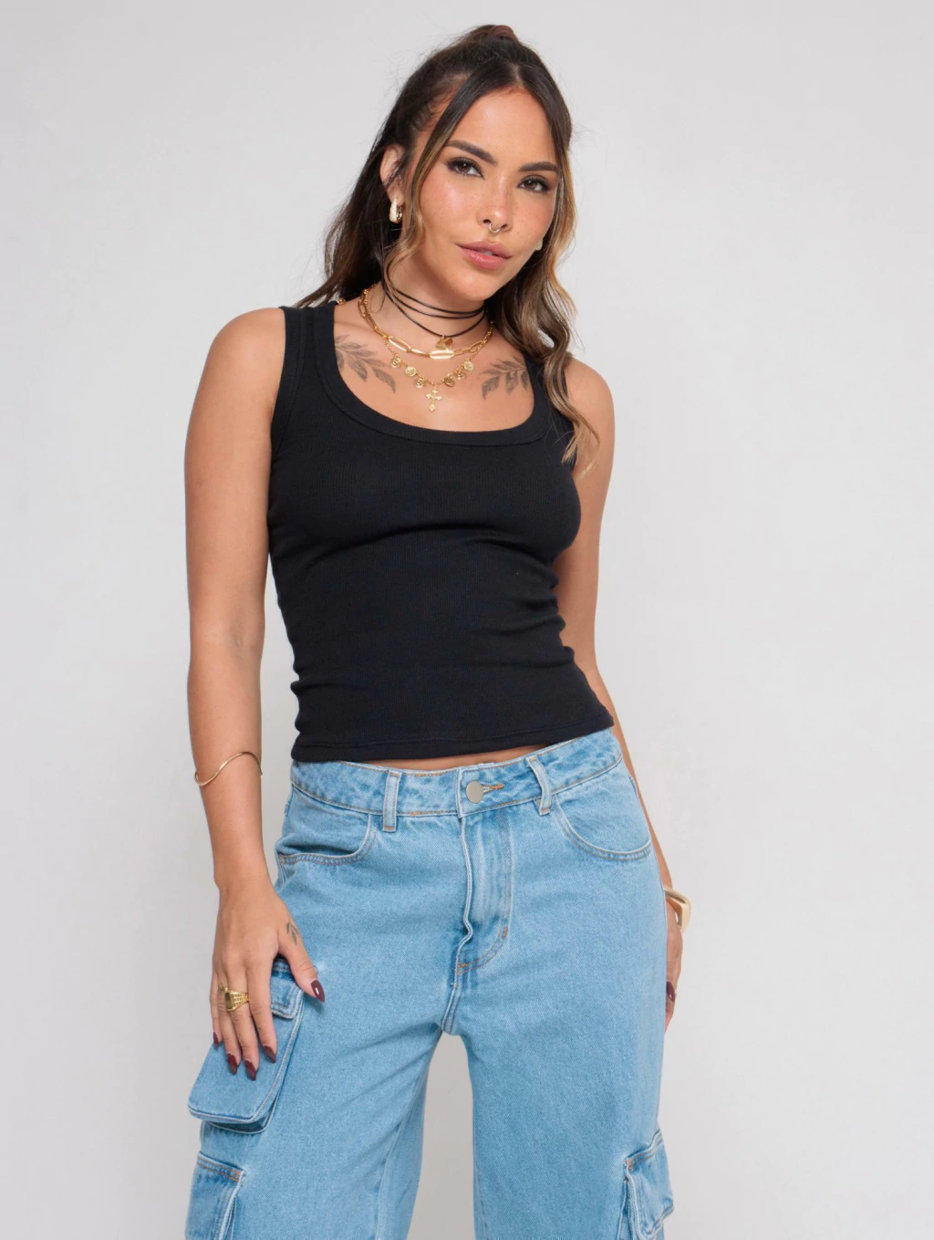 Descrição: Aquela básica que não pode faltar. Com tecido canelado, toque macio e caimento justinho, essa regata tem decote que valoriza o colo e combina fácil com qualquer parte de baixo. Ideal pra usar sozinha ou como base de sobreposições — prática, versátil e estilosa na medida.