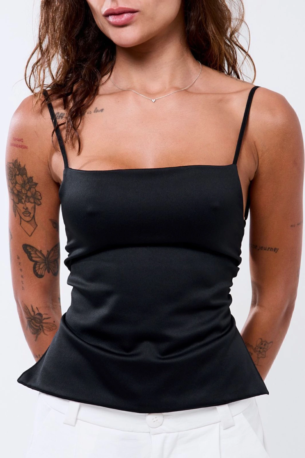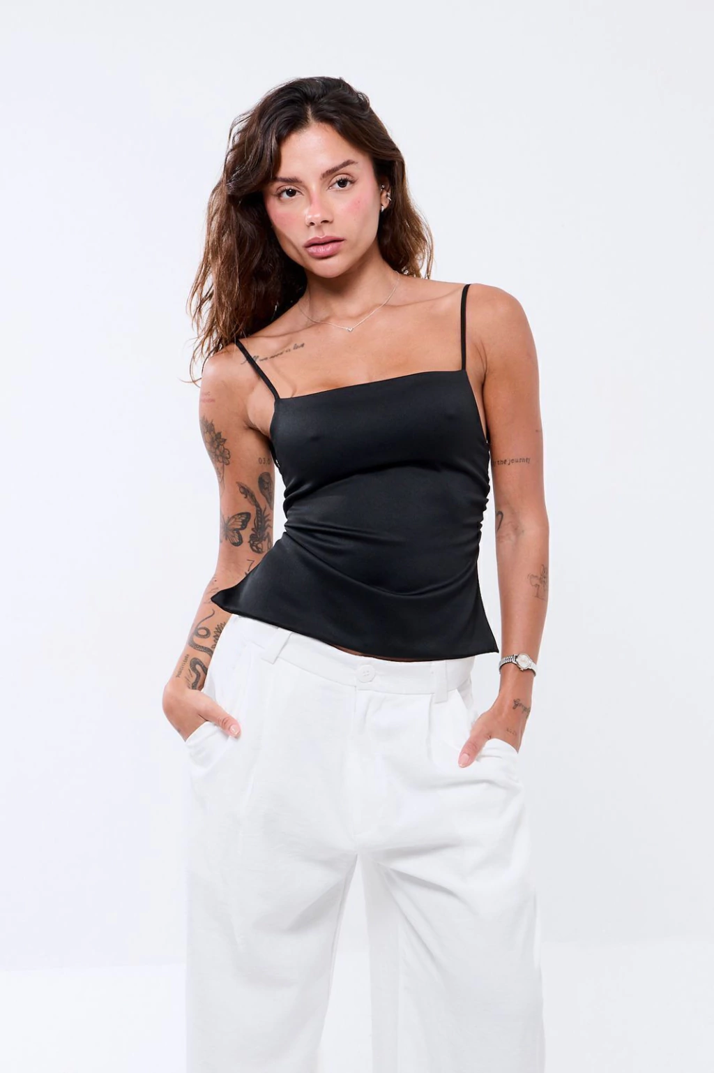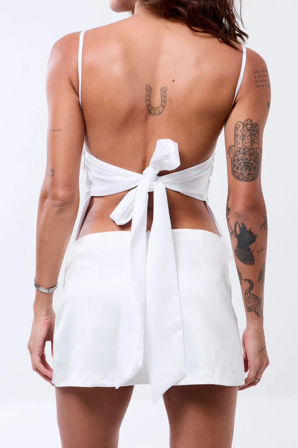 Descrição: Blusa de alça fina com regulador e costas abertas. Possui faixa para amarração que permite ajustar o busto e as costas. Leve, minimalista e perfeita para compor várias produções.