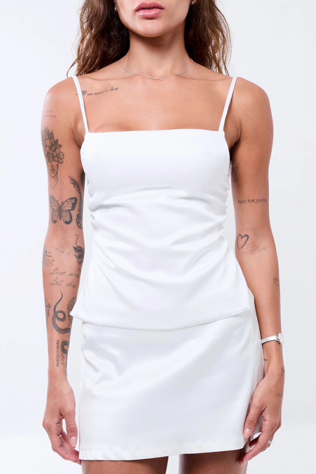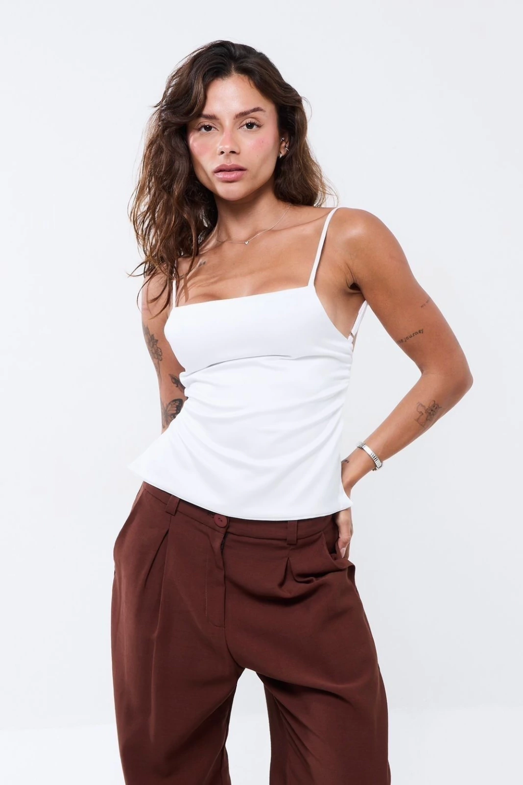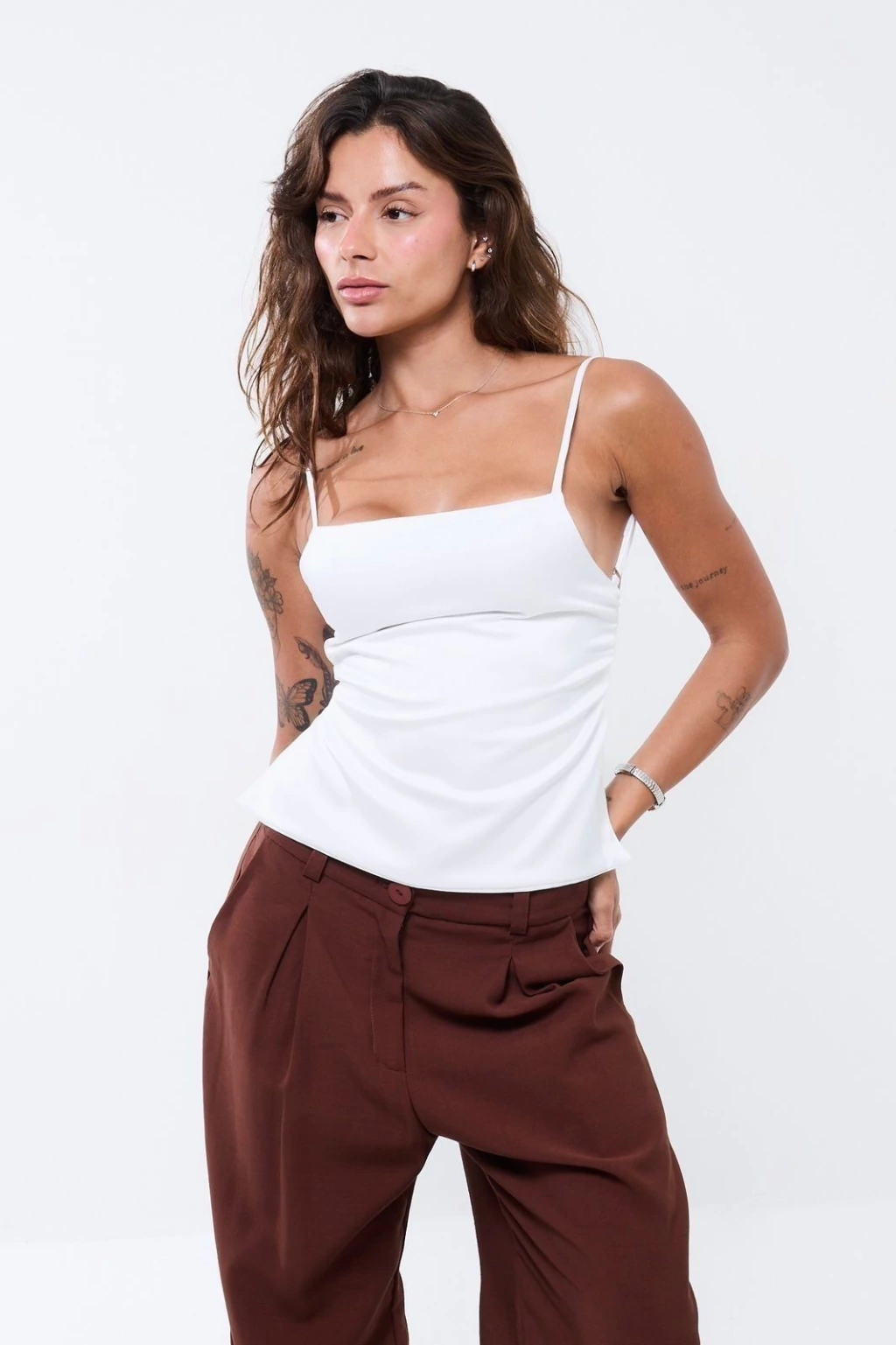 Descrição: Blusa de alça fina com regulador e costas abertas. Possui faixa para amarração que permite ajustar o busto e as costas. Leve, minimalista e perfeita para compor várias produções.