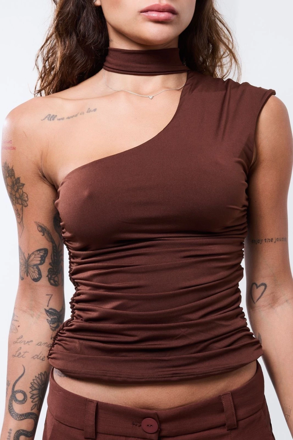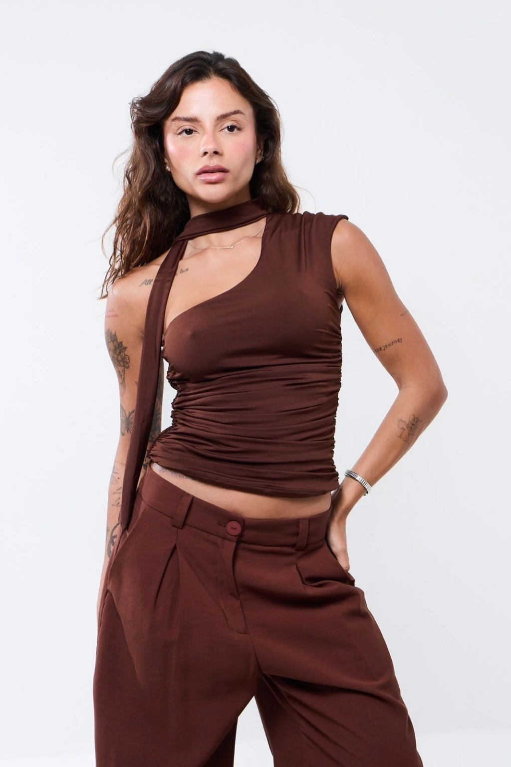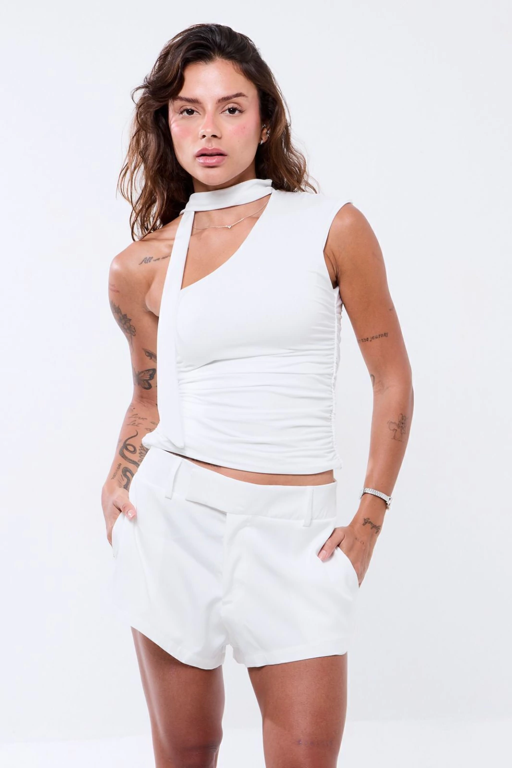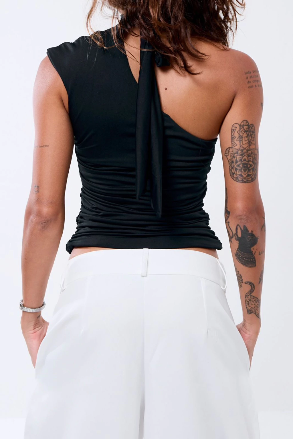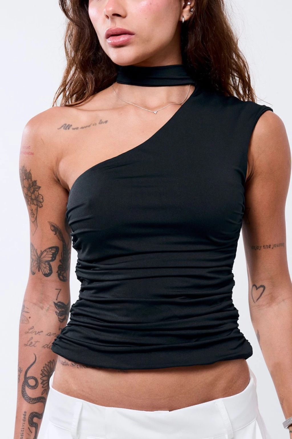 Descrição: Blusa um ombro só com detalhe drapeado nas laterais e faixa para amarrar como gola ou usar como cachecol.