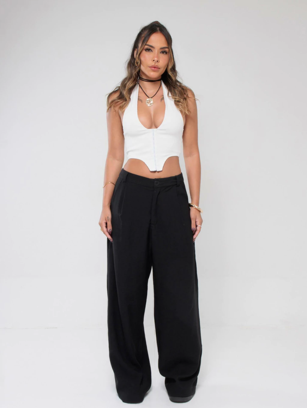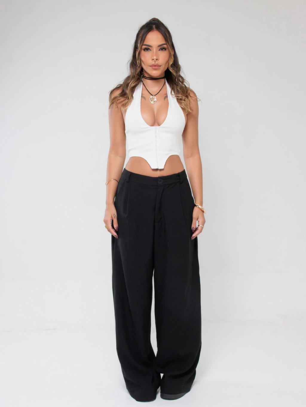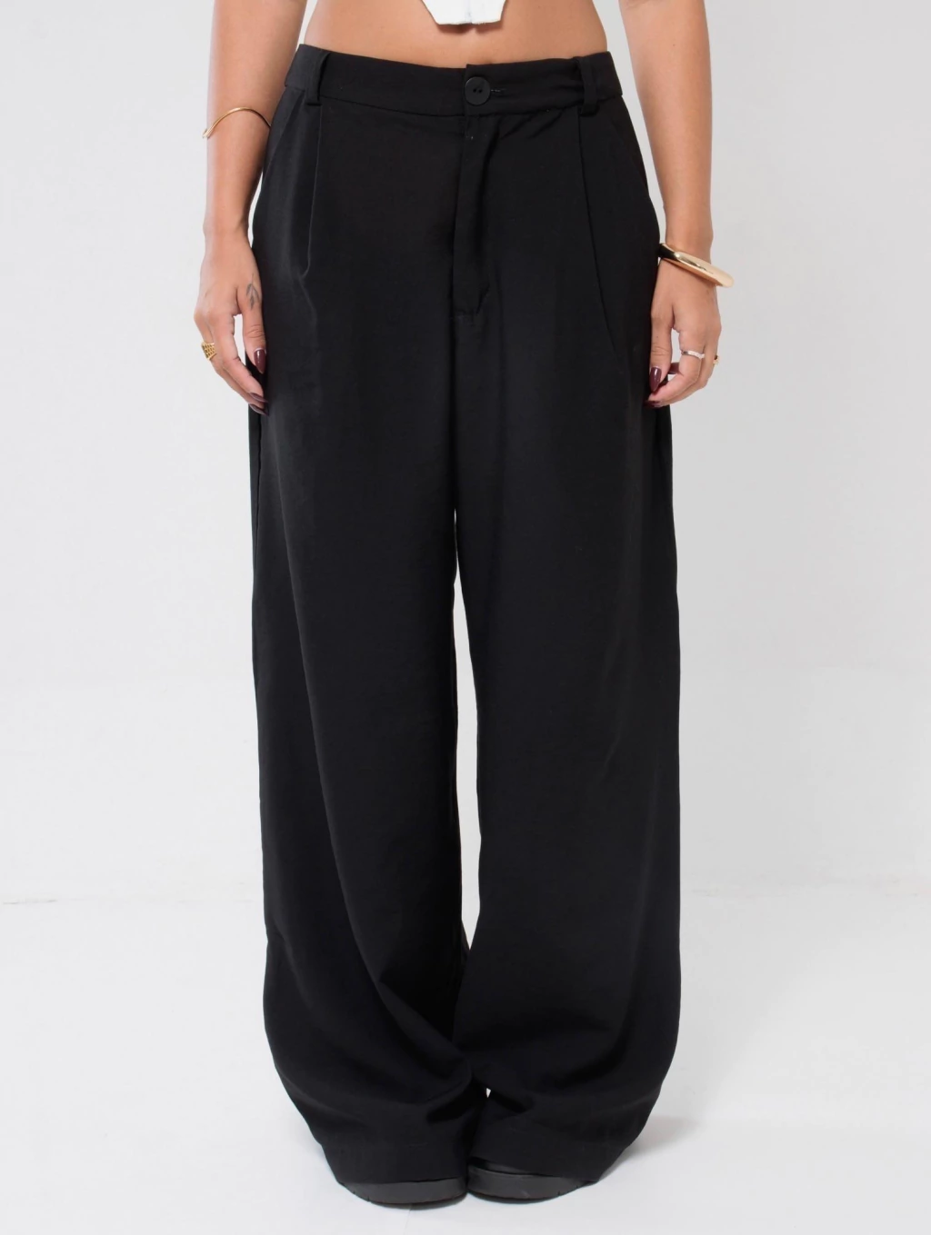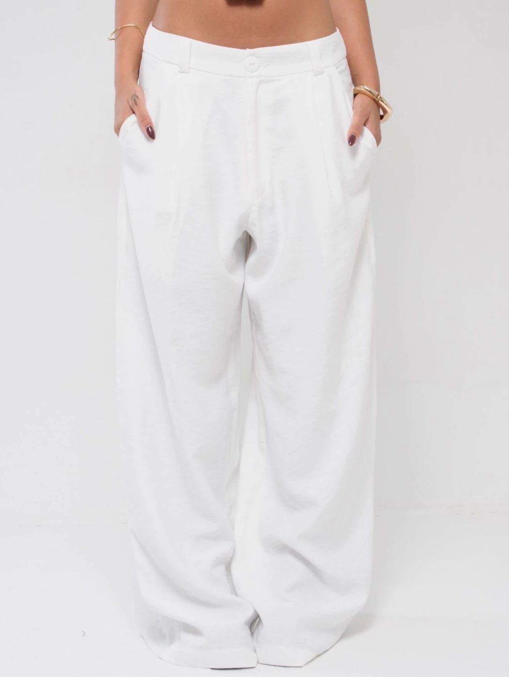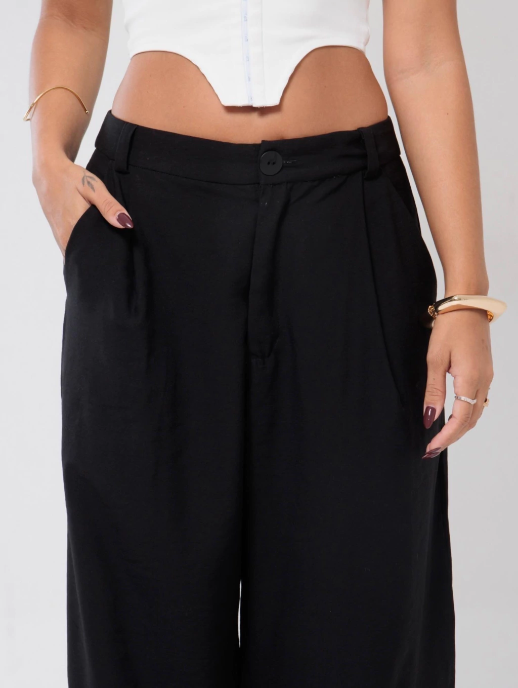 Descrição: A calça perfeita pra quem ama conforto sem abrir mão de estilo. Com cintura baixa e modelagem ampla, ela tem aquele caimento leve que vai bem com tudo — do top cropped à camiseta larguinha. Possui fechamento por botão e zíper, pregas frontais sutis e bolsos laterais funcionais.