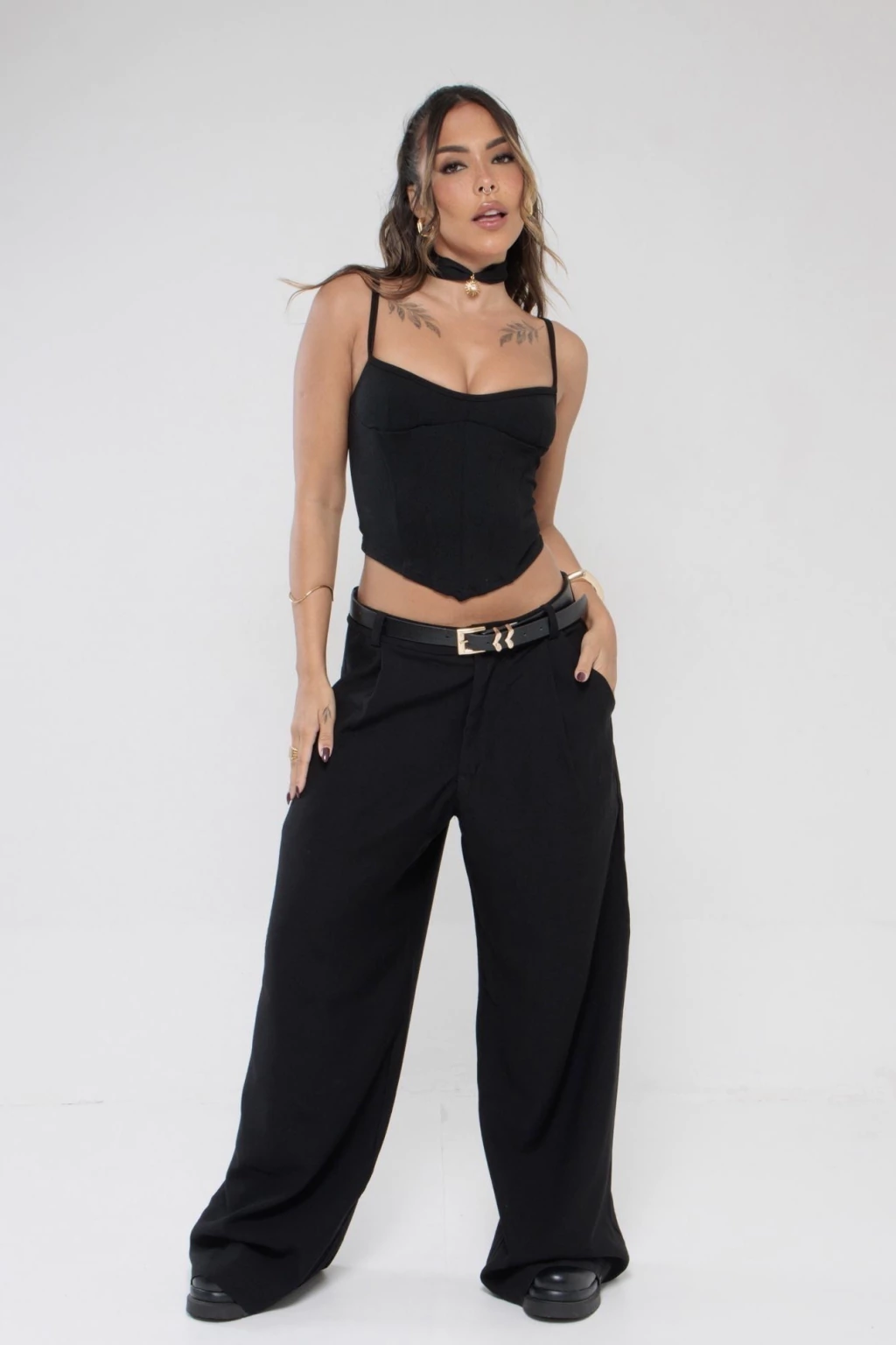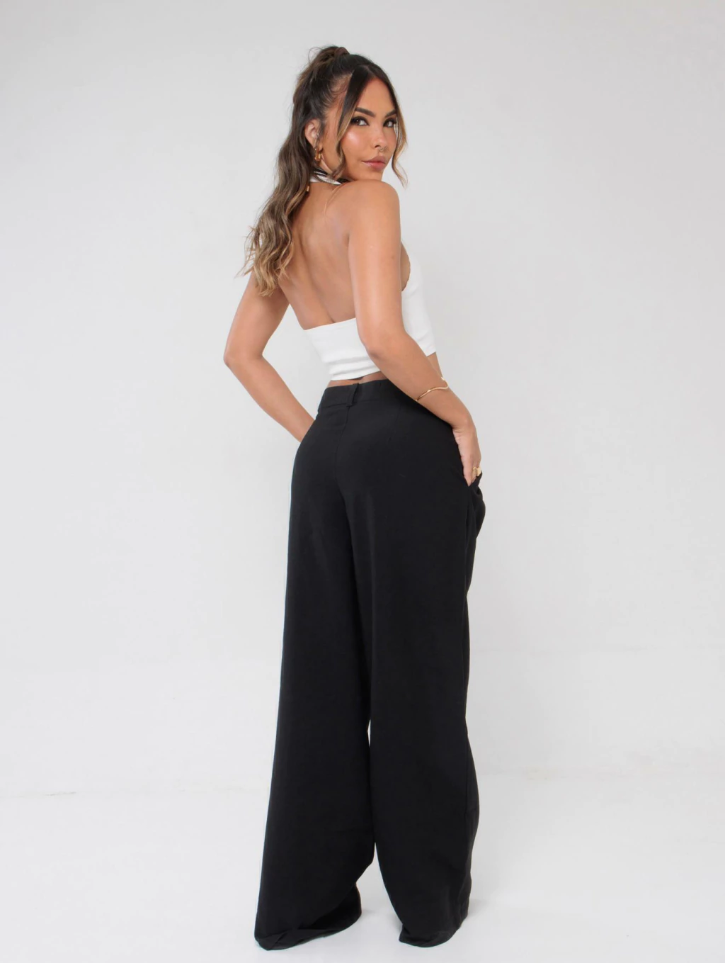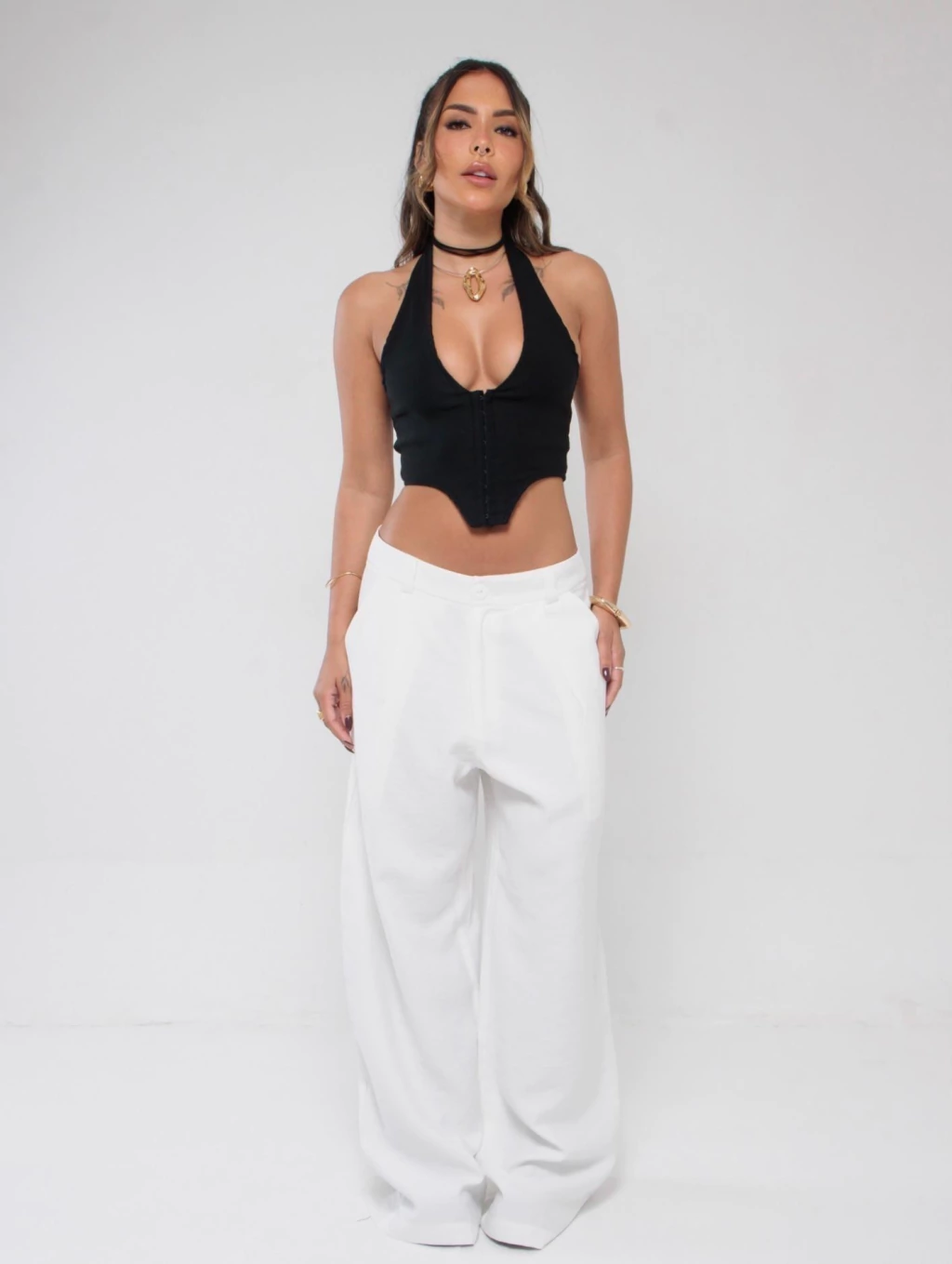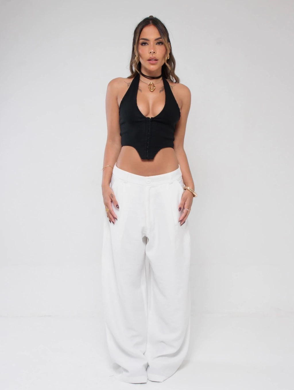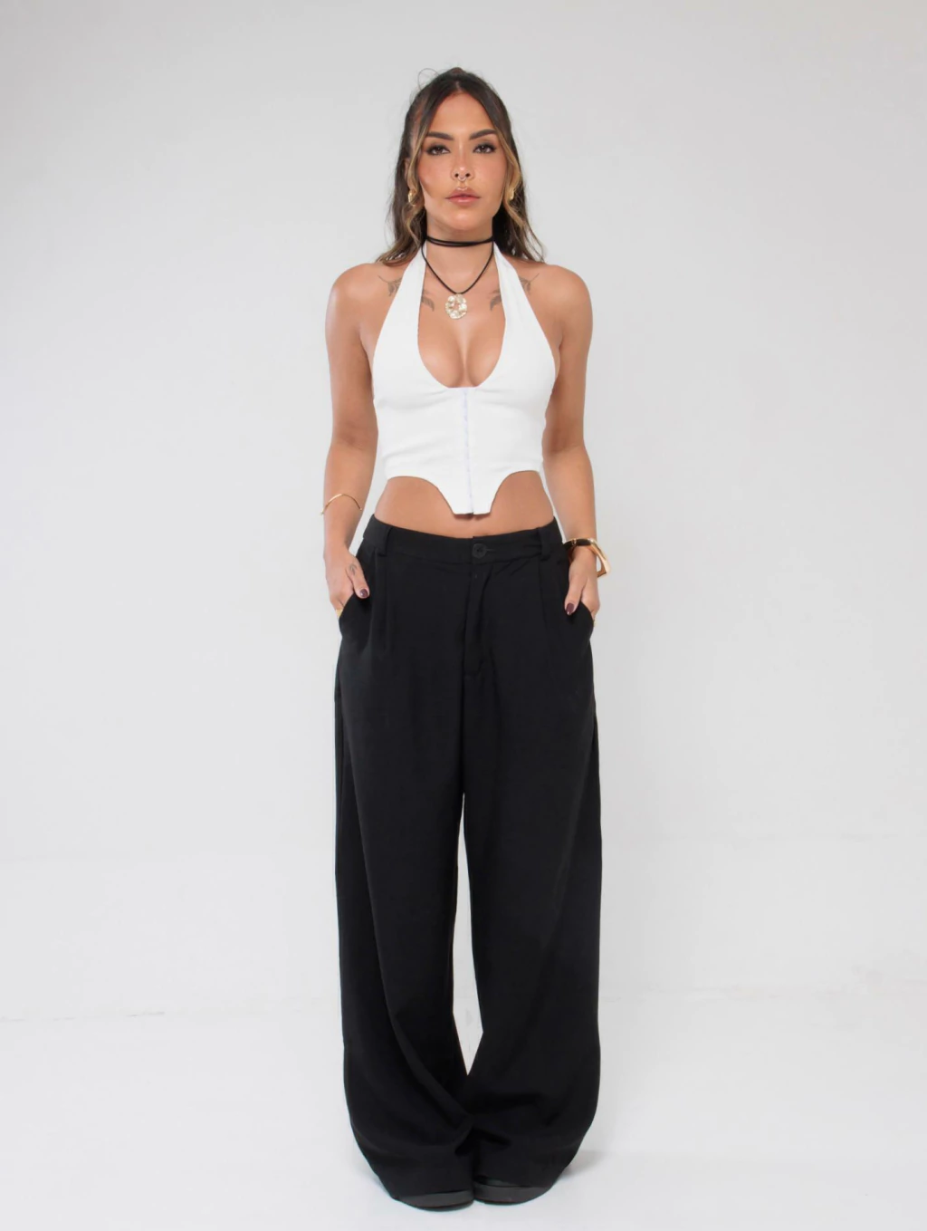 Descrição: A calça perfeita pra quem ama conforto sem abrir mão de estilo. Com cintura baixa e modelagem ampla, ela tem aquele caimento leve que vai bem com tudo — do top cropped à camiseta larguinha. Possui fechamento por botão e zíper, pregas frontais sutis e bolsos laterais funcionais.