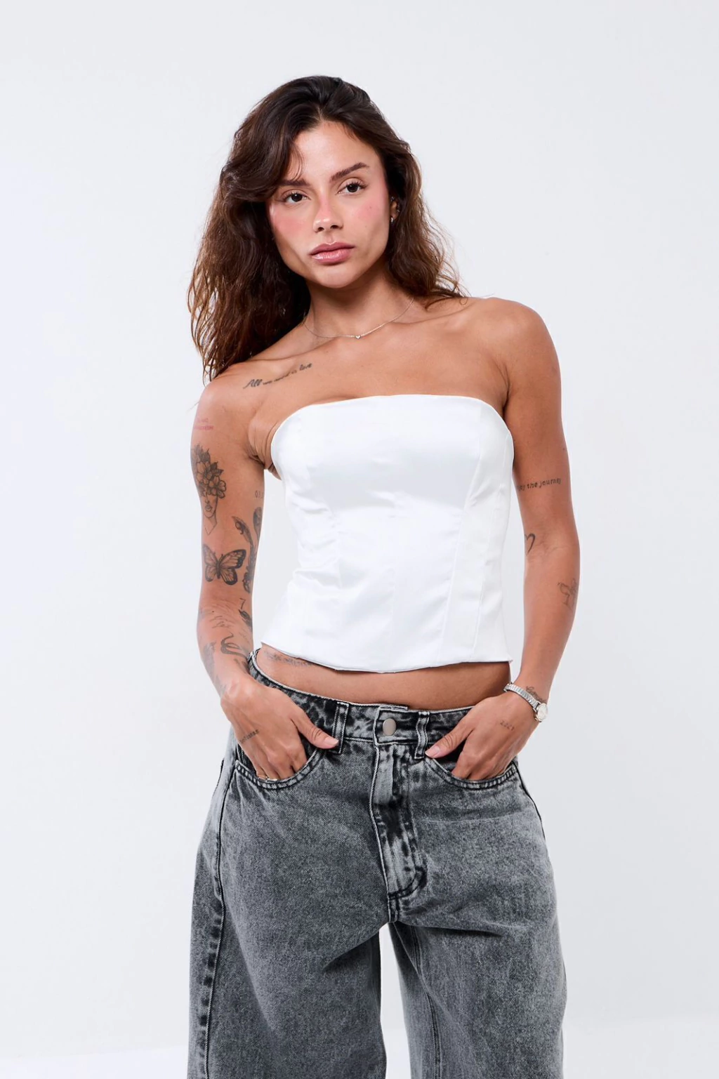Descrição: Corset tomara que caia acetinado, estruturado com barbatanas para valorizar a silhueta e fecho por amarração com ilhós nas costas que permite um caimento perfeito.