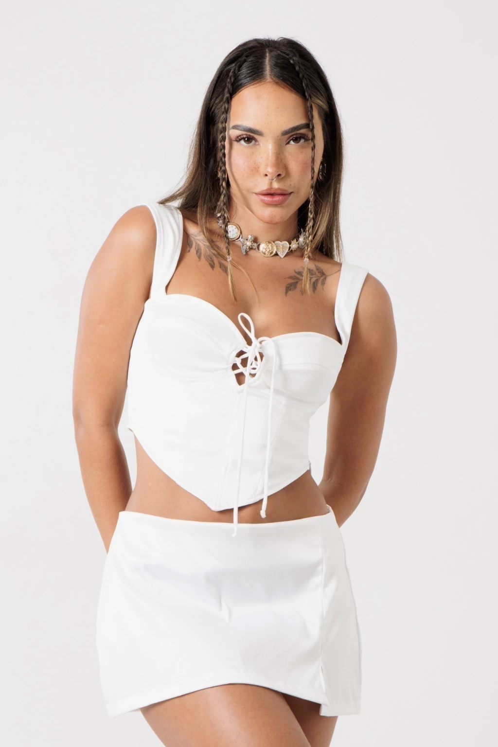 Descrição: Corset em cetim, com amarração frontal ajustável e alças largas para maior sustentação. Estruturado para valorizar a silhueta, une sensualidade e sofisticação. Perfeito para compor looks modernos e versáteis.