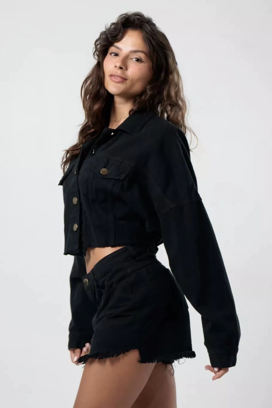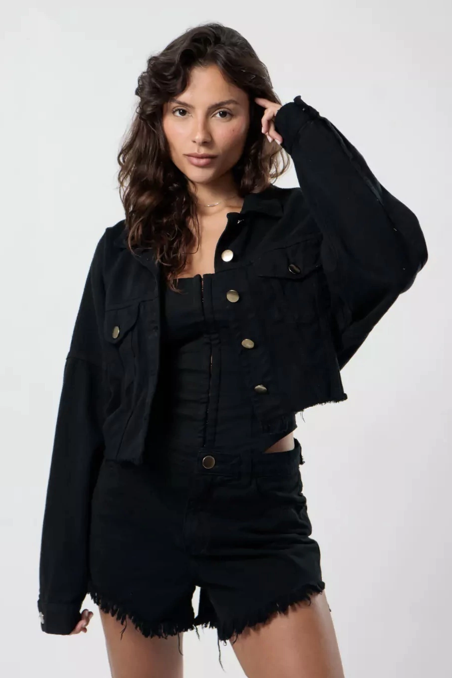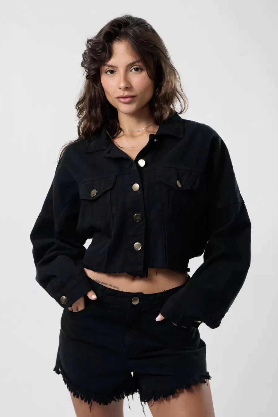 Descrição: Jaqueta sarja com mangas bufantes, elástico nas costas, detalhe bolsos e botões dourados frontais.