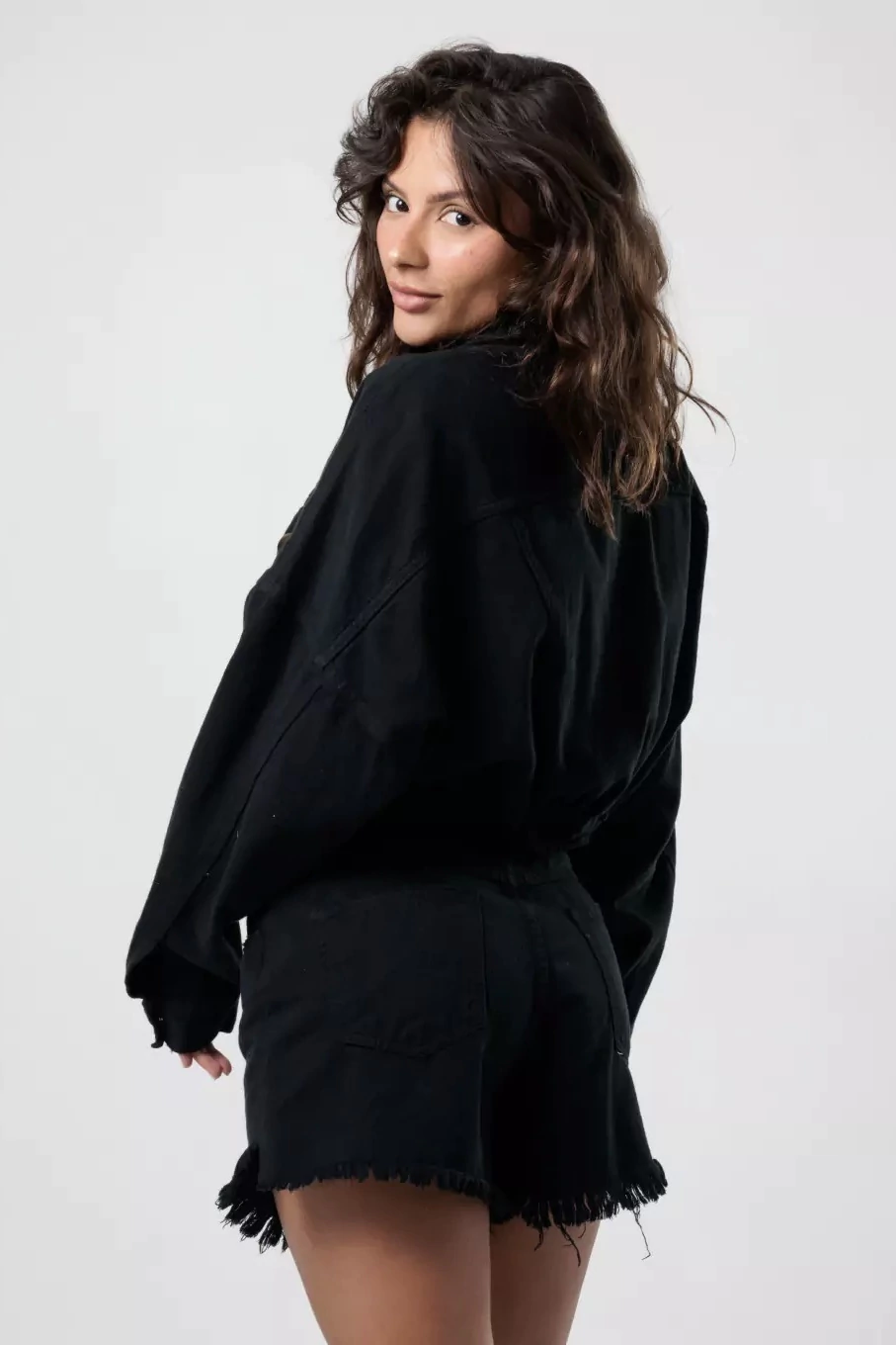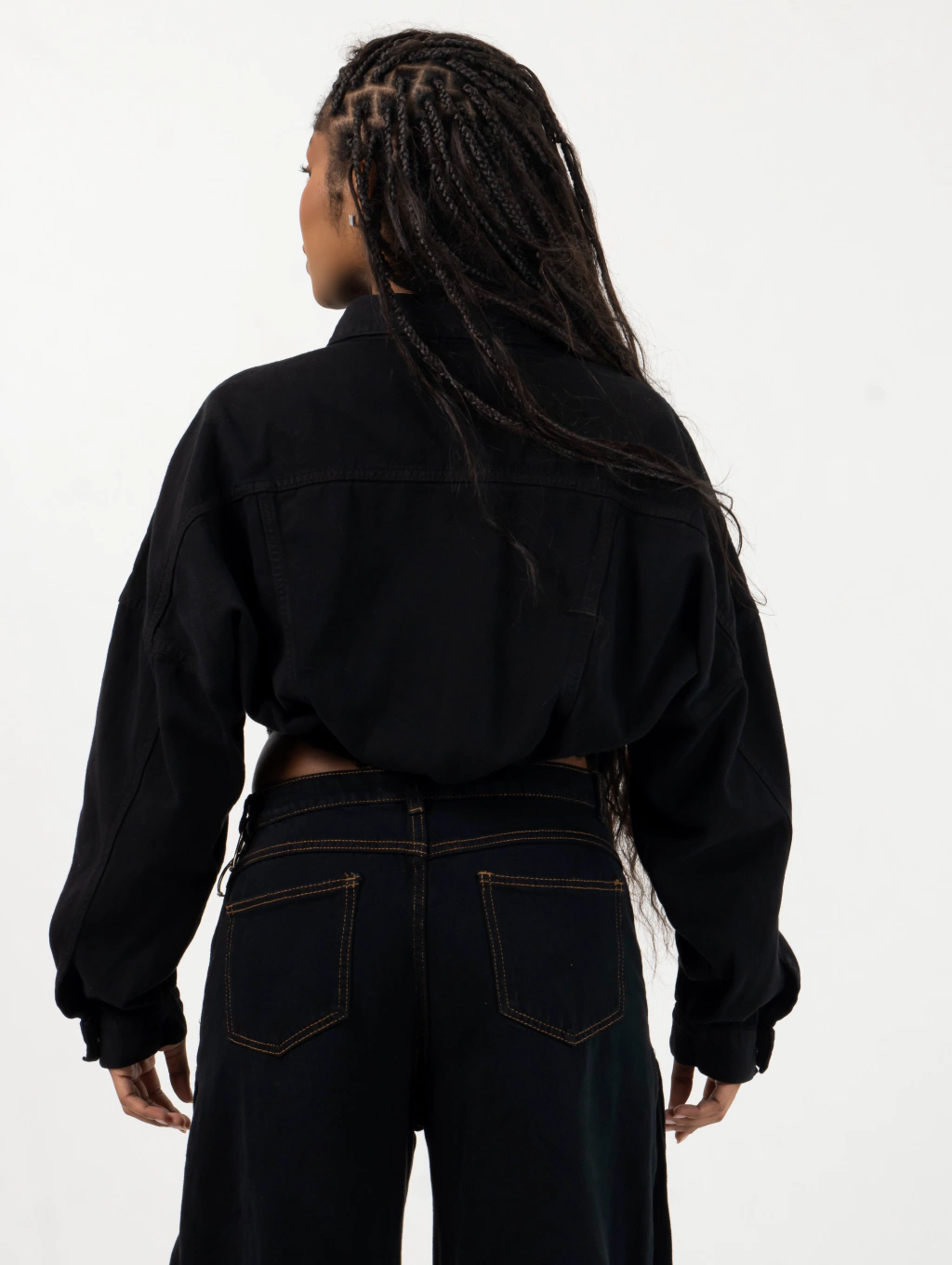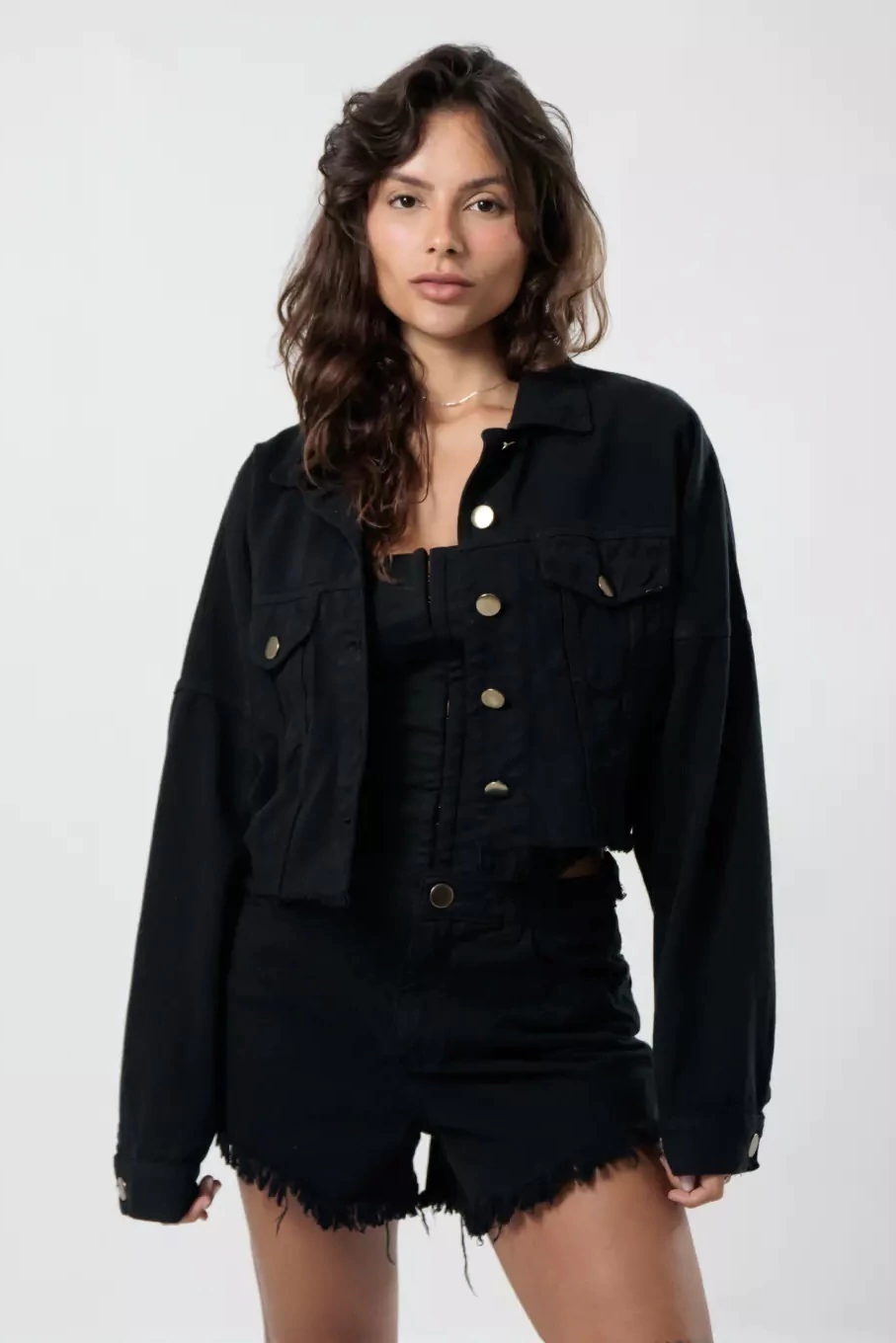 Descrição: Jaqueta sarja com mangas bufantes, elástico nas costas, detalhe bolsos e botões dourados frontais.