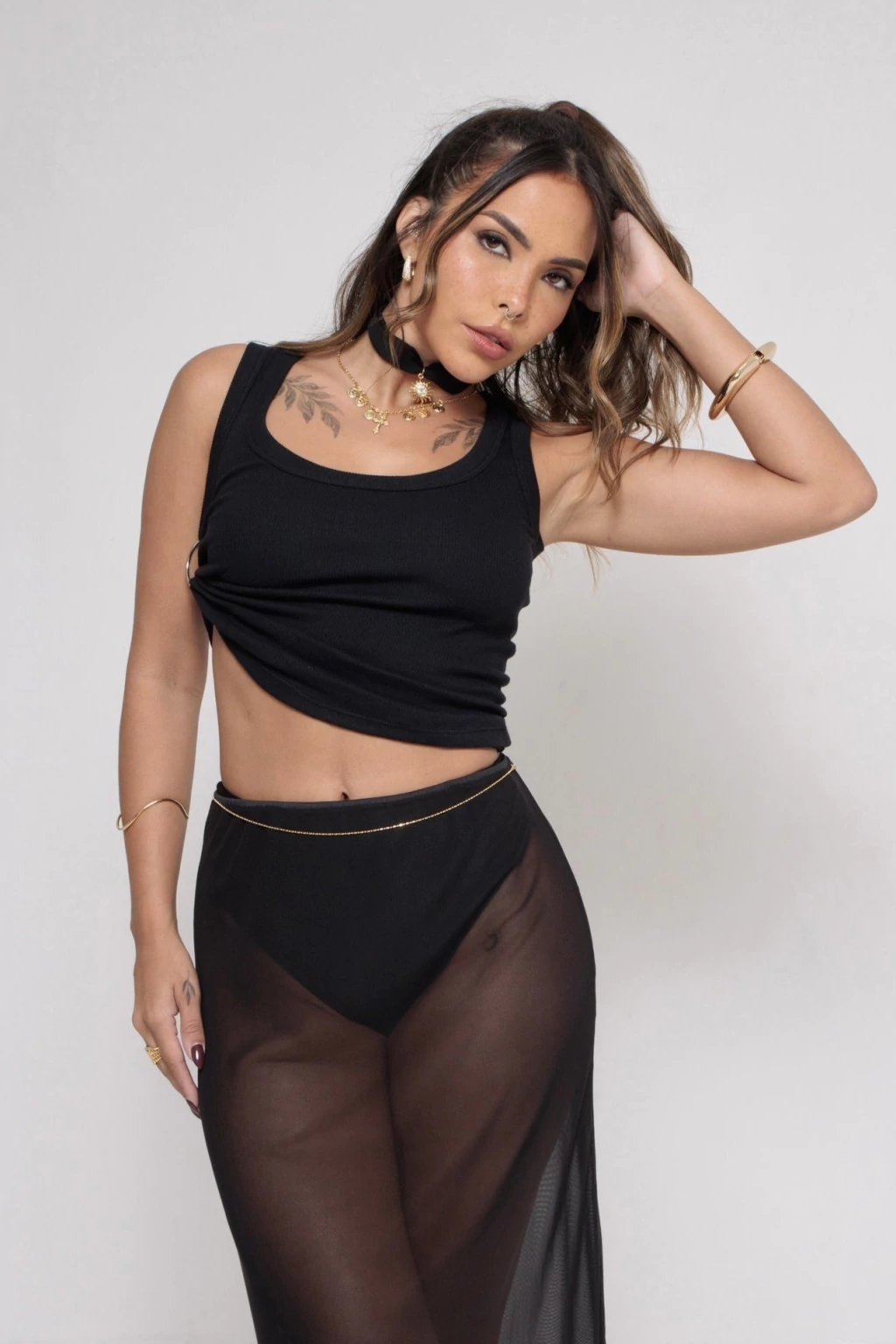 Descrição: Saia longa em tule com transparência. Pode ser usada com forro, hotpants ou com biquíni como saída de praia.