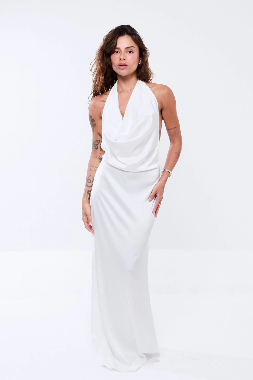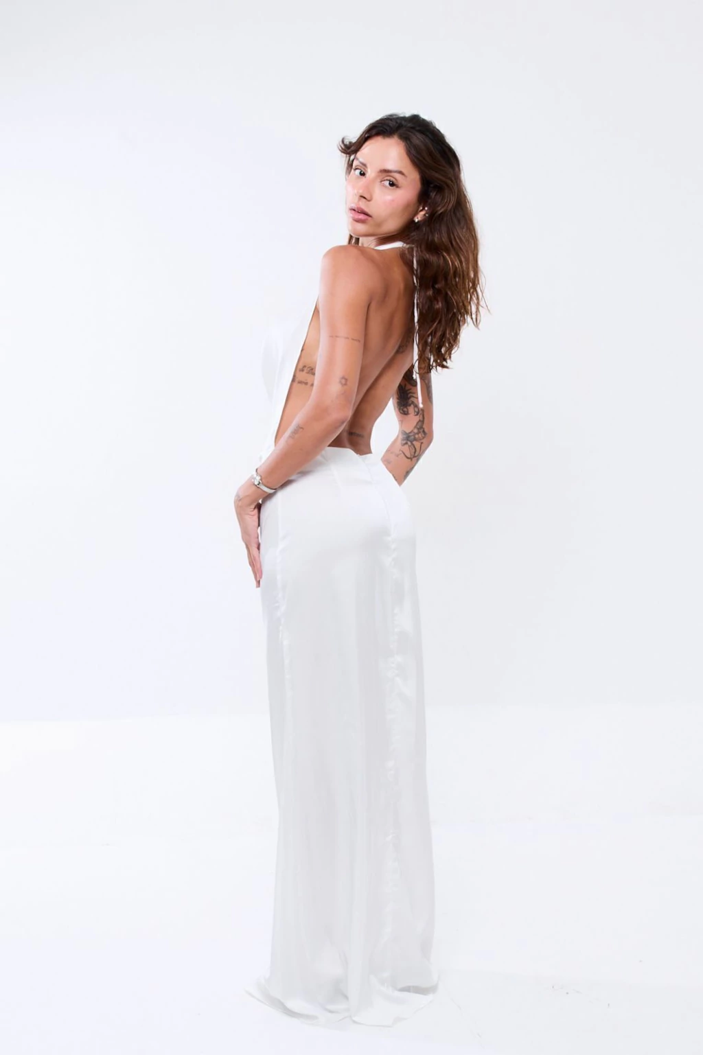 Descrição: Vestido longo frente única com costas nua, alça ajustável por amarração no pescoço, decote degage e fecho em zíper nas costas.