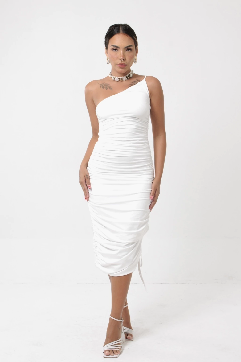 Descrição: Vestido midi um ombro só com alça ajustada por amarração, drapeado nas laterais e com regulador que permite deixar a barra reta ou com detalhe assimétrico.